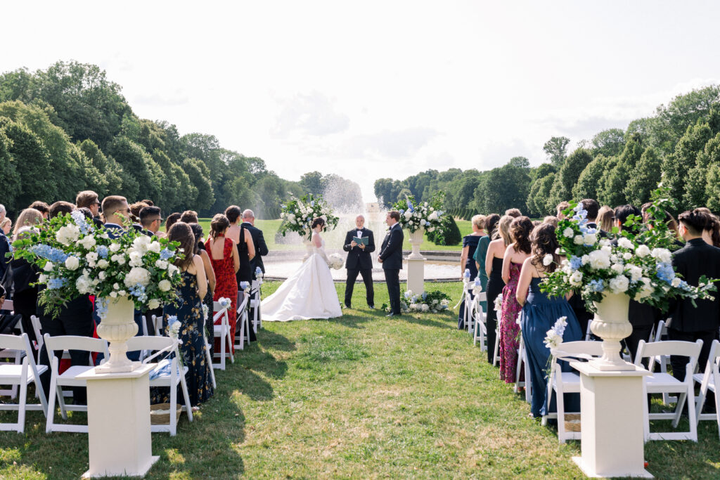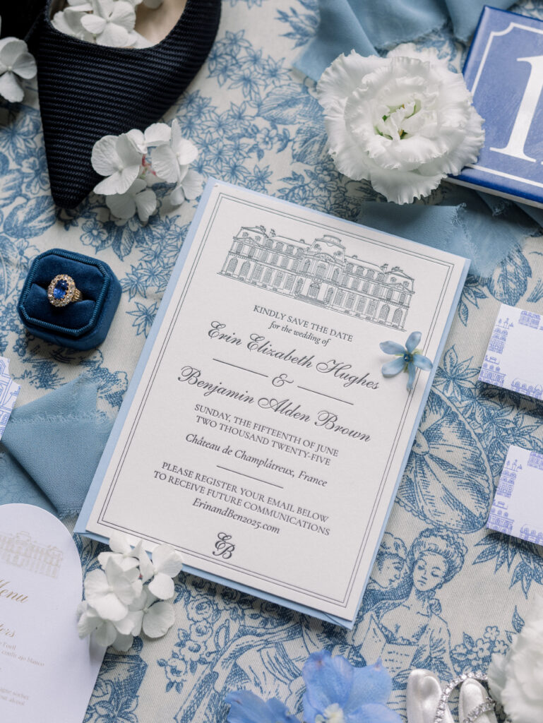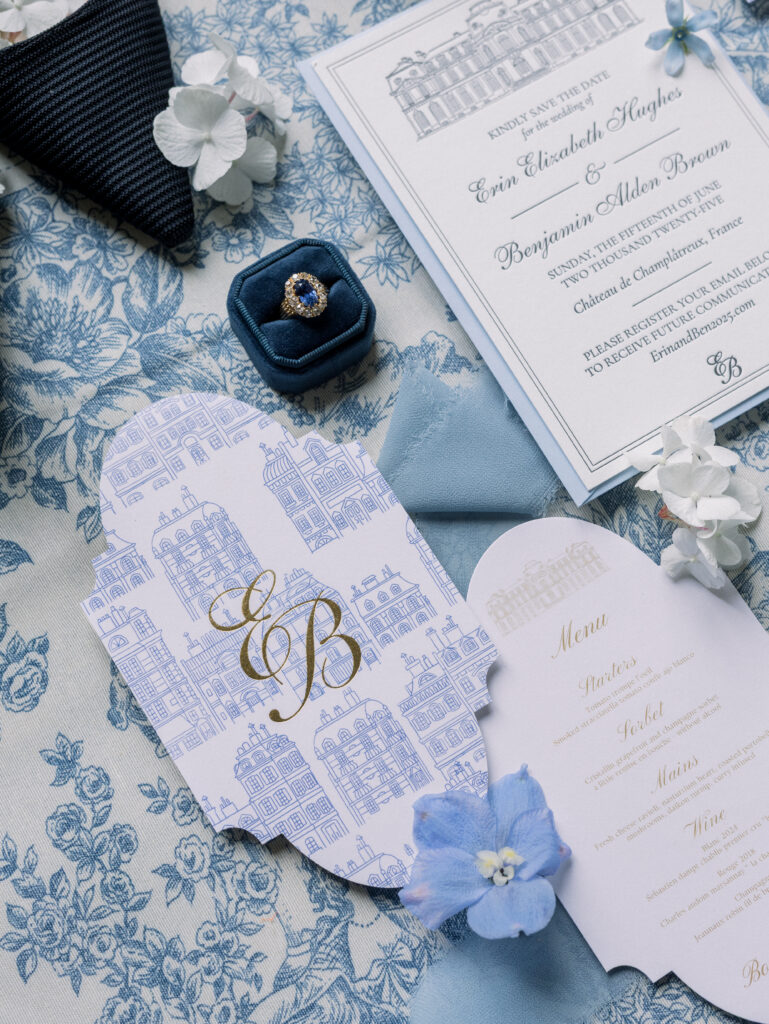 Erin and Ben, a New York couple with a deep love for Paris, chose the city as the backdrop for their elegant destination wedding. Their celebration combined timeless French style with meaningful personal details, featuring a refined outdoor ceremony, a lively reception filled with energy, and a custom design built around Erin’s favorite shade of blue.